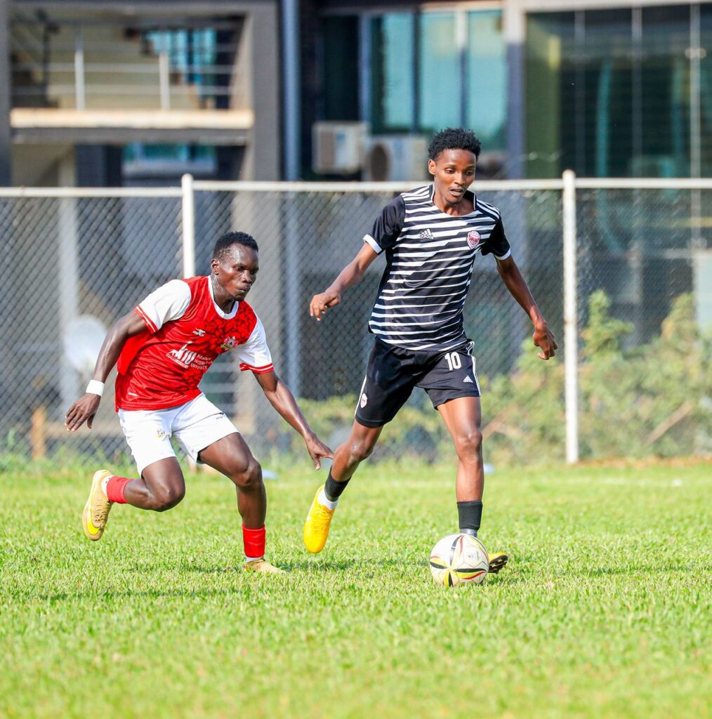 Nyanzi Marvin (B) dribbling past Ntugasaze defender. Photo credit: Sportslens
